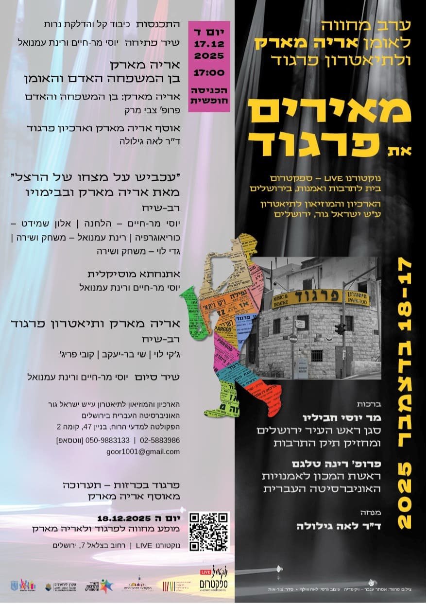 ביום רביעי, 17 בדצמבר 2025, התקיים בארכיון גור ערב המחווה הראשון. מר יוסי חביליו, סגן ראש עיריית ירושלים ומחזיק תיק התרבות, כיבד את הערב בנוכחותו ואף הדליק נר רביעי של חנוכה. פרופ’ צבי מרק סיפר על דודו המיוחד, אריה מארק. המלחין יוסי מר־חיים, הזמרת רינת עמנואל, השחקן והמדבב גדי לוי ואנשי במה נוספים, בהם ג’קי לוי וקובי פריג’, שיתפו בזיכרונות מהעבודה עם אריה מארק ובתיאטרון פרגוד, וסיפרו על השפעתו על דרכם האמנותית ועל חיי התרבות בירושלים. את הערב הנחתה מנהלת ארכיון גור, ד”ר לאה גילולה.